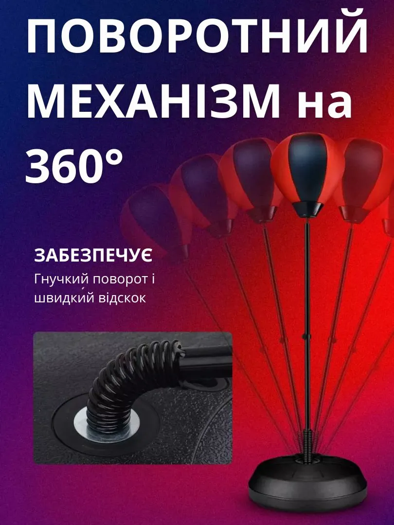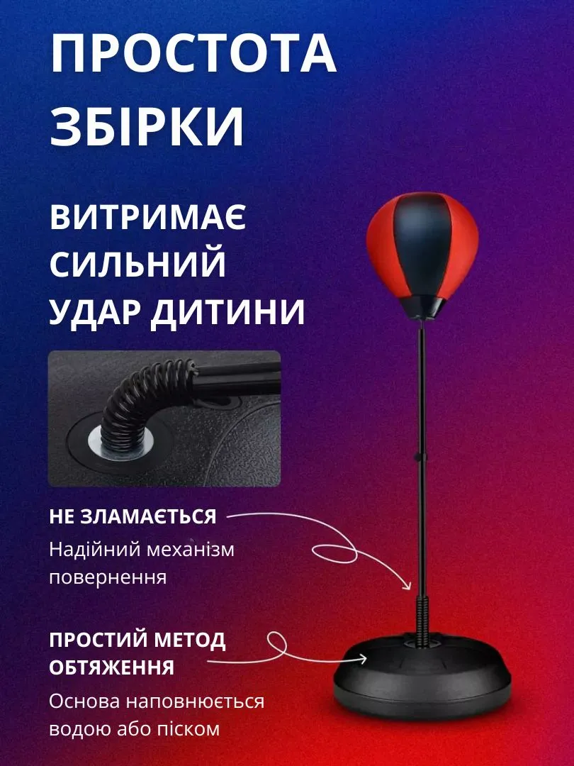 Боксерський набір стійко тримається на поверхні, тому без проблем витримає сильний удар дитини. Жорстка пружинка на 360° забезпечує гнучний поворот та швидкий відскок груші.