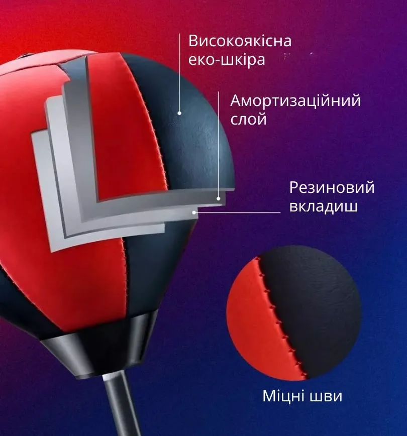 Груша виготовлена з високоякісної еко-шкіри. Має амортизаційний шар та резинові вкладиші. Шви міцно та надійно прошиті.