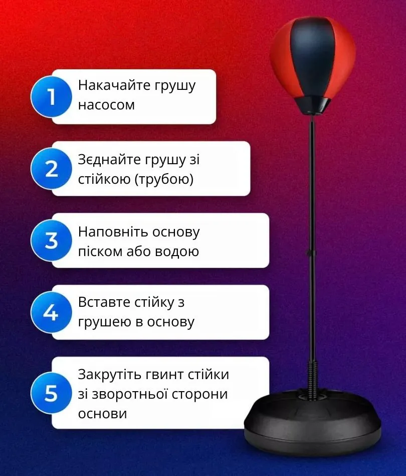 Наш боксерський набір дуже легко збирається. Просто накачайте грушу насосом, з'єднайте грушу зі стійкою (трубою), вставте стійку з грушею в основу та прикріть основу присоскою до поверхні.