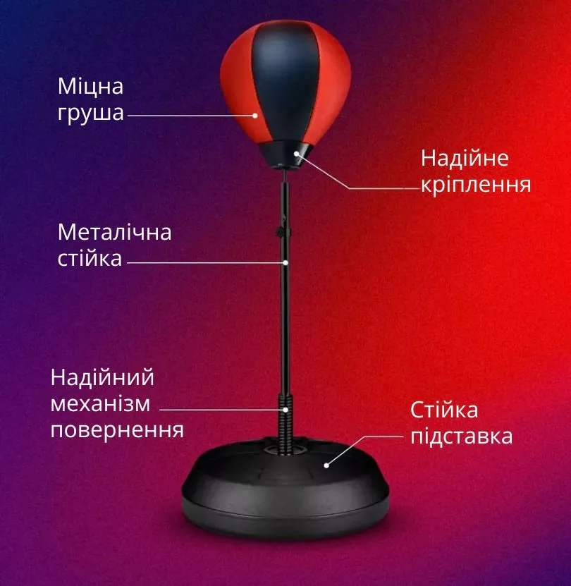Боксерський набір стійко тримається на поверхні, тому без проблем витримає сильний удар дитини. Жорстка пружинка на 360° забезпечує гнучний поворот та швидкий відскок груші.